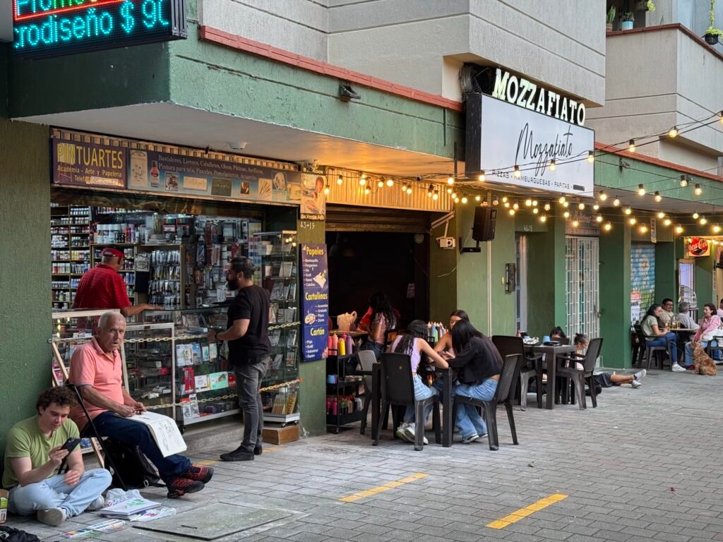 Plazoleta Nueva Villa de Aburrá is worth knowing about. During the week it’s calm — a few cafés, people eating on the sidewalk, the occasional salon. On Friday and Saturday evenings it fills up. Locals out after work, families, people lingering. It’s the kind of thing that makes you feel like you actually live somewhere rather than visit it.